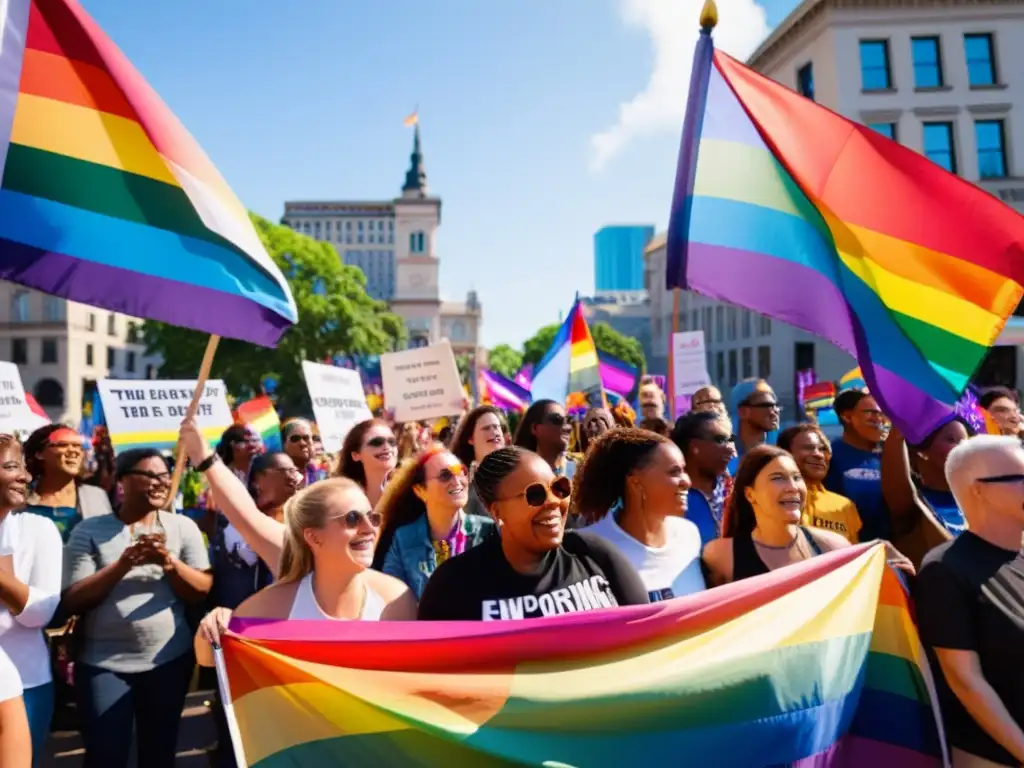 Un vibrante grupo diverso sostiene pancartas por los derechos humanos LGTBIQ+ en una marcha llena de energía y solidaridad