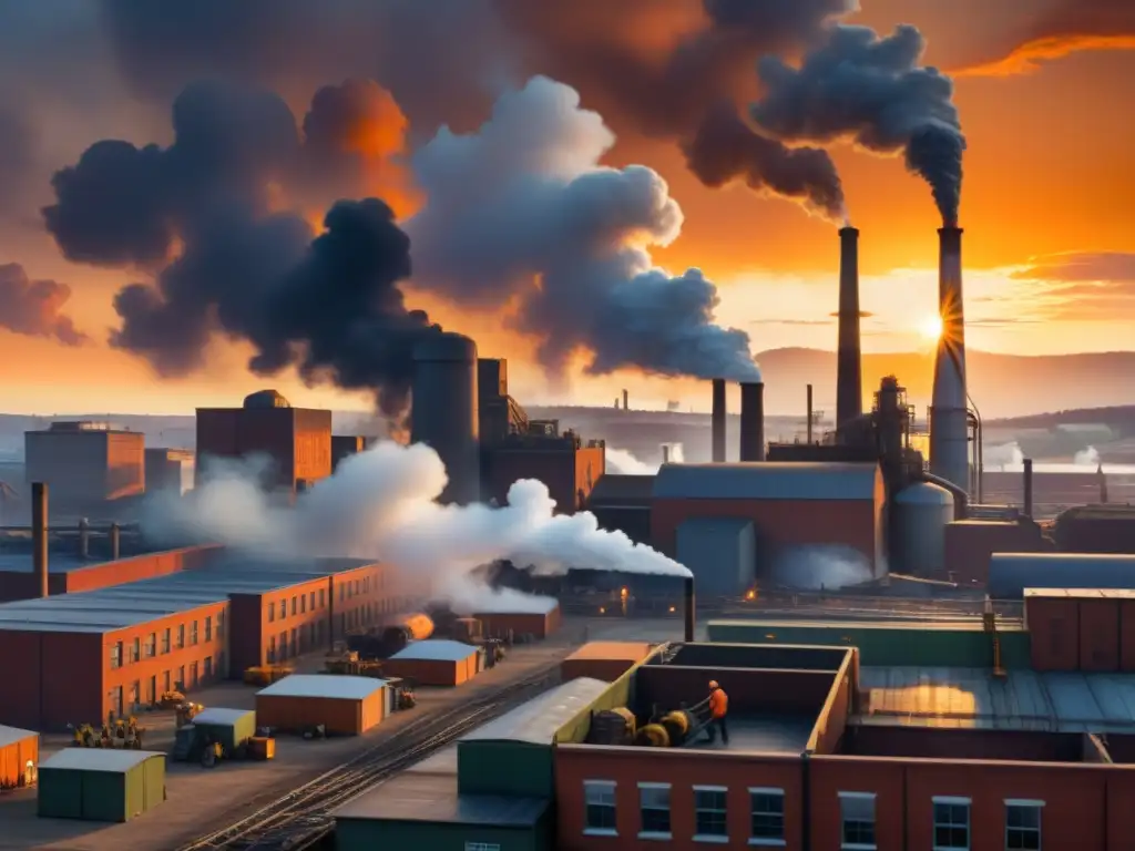 Vista de una ciudad industrial con humo tóxico y trabajadores en equipo, destacando el impacto del libre comercio en los derechos laborales